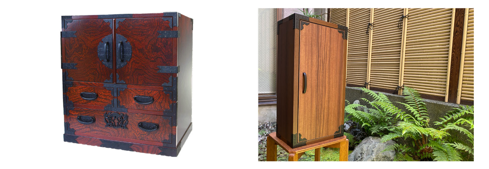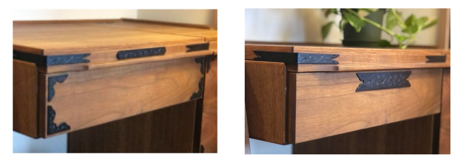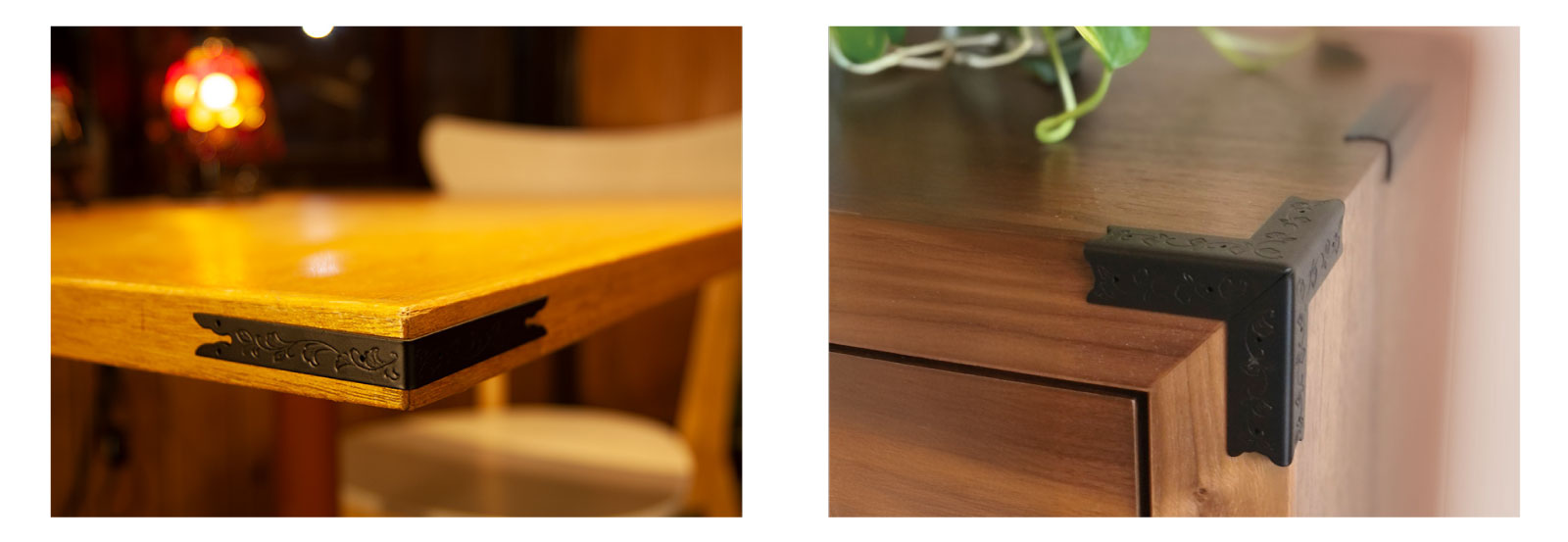「和映え収納BOX」にも使用されている、焼き付け黒色塗装を施した民芸家具調の装飾金具のシリーズです。重厚でクラシックな風合いが特徴で、和室家具やリメイクDIYとの相性も抜群。全国の家具メーカーやリフォーム事業者、そしてDIY愛好家の皆さまからも、長年にわたり高い支持をいただいています。豊富な形状バリエーションをご用意しています。