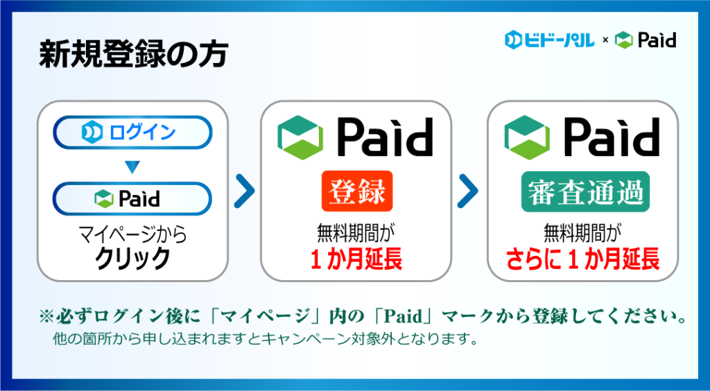 - マイページに表示される「Paidキャンペーンマーク」以外からでは本キャンペーンが適用されません。必ずマイページの「Paidマーク」から申請してください