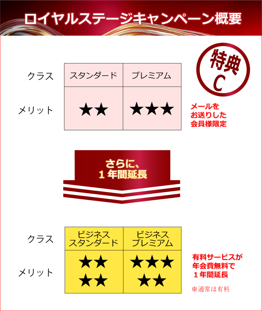 そして、次に特典Cとしてご用意させていただいているのが、期間内のご注文で最大1年3か月のビジネスクラスの年会費が無料になる「ロイヤルステージキャンペーン」です。