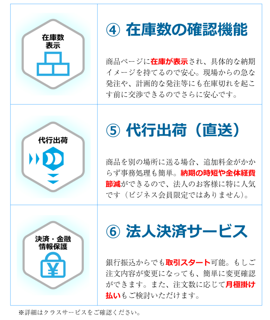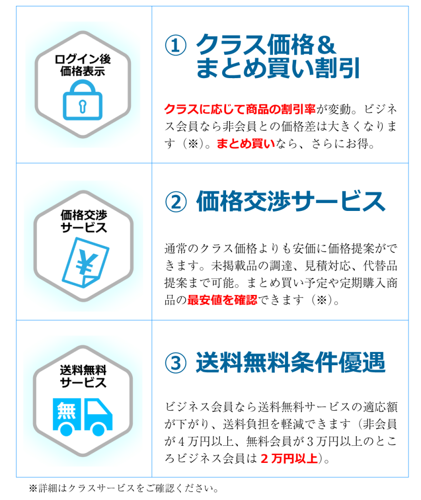 - 定期購入商品やまとめ買い商品があれば、ビジネスクラスの「価格交渉サービス」によって最安値を確認可能(マイページから履歴確認が可能)