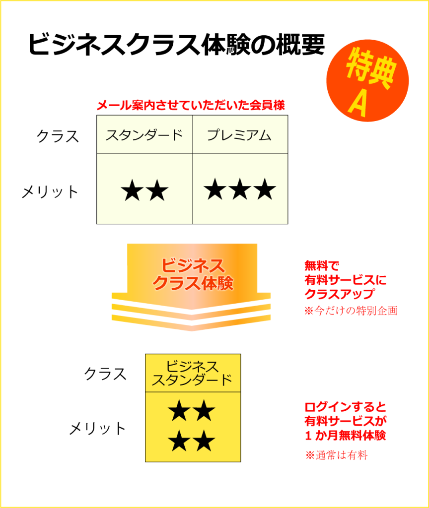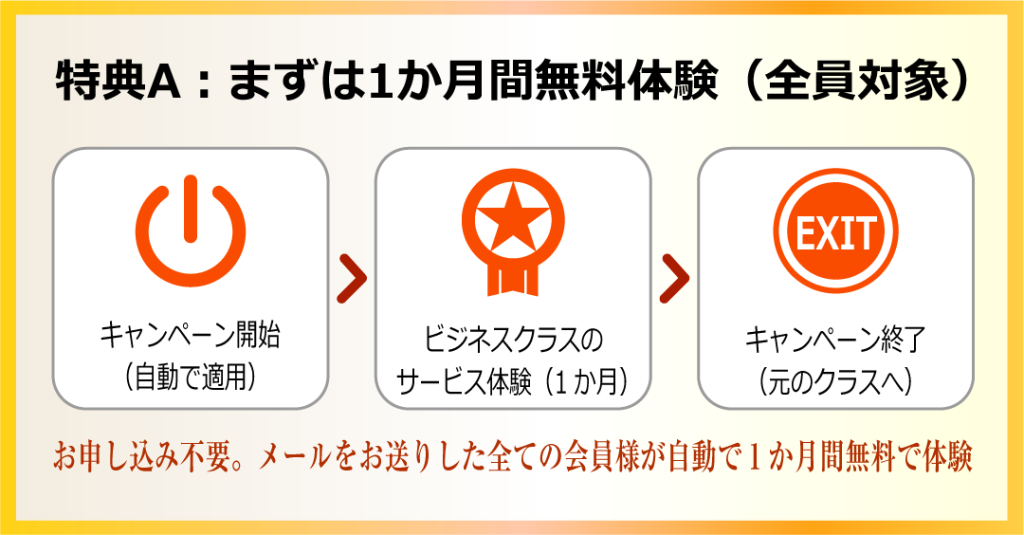 皆様はスタンダードかプレミアムクラスの無料会員様ですが、まずは特典Aとして、皆様のアカウントは現在、ビジネスクラスの無料体験がすでに適用されています。ログインすることでこれまでにない法人向けサービスと価格メリットをご確認いただけます。